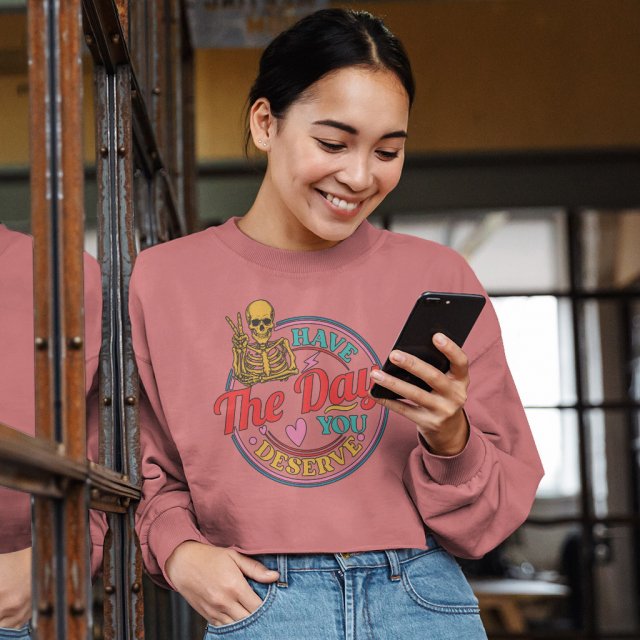 Have The Day You Deserve Cropped Long Sleeve Sweatshirt – Positive Graphic Women’s Crop Top – Funny Skeleton Long Sleeves Pullover