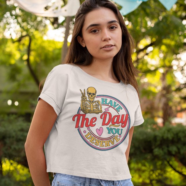 Have The Day You Deserve Cropped T-Shirt – Positive Graphic Trendy Tee – Funny Skeleton Women’s Basic T-Shirt