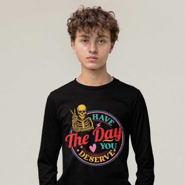 Have The Day You Deserve Long Sleeve T-Shirt – Positive Graphic T-Shirt – Funny Skeleton Basic Tee