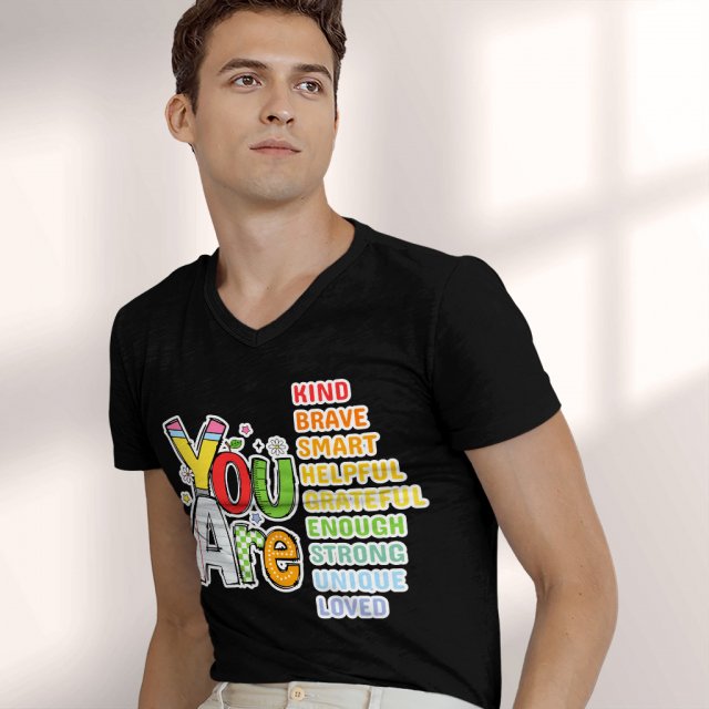 You Are Kind Loved Brave Enough V-Neck T-Shirt – Positive Affirmations Basic T-Shirt – Colorful Design Tee